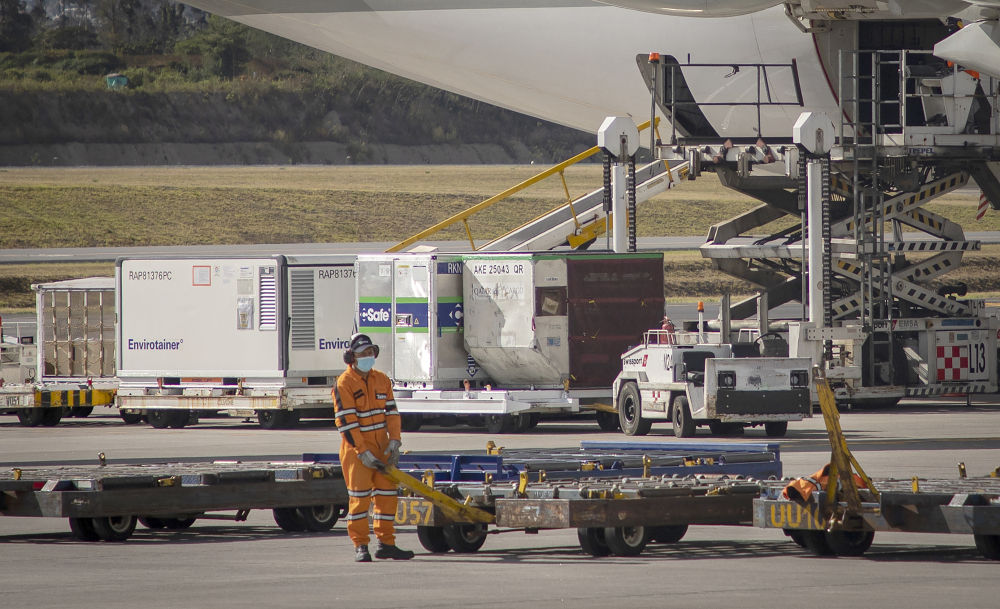 厄瓜多尔政府采购的第一批中国康希诺新冠疫苗8月3日上午运抵厄瓜多尔首都基多苏克雷国际机场。(新华社发,圣地亚哥·阿马斯摄)