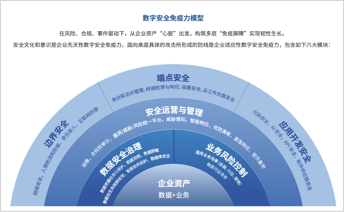 数字安全免疫力是一个企业针对各种数字安全威胁时的防御机制,与人体免疫力相似,企业数字安全免疫力包含两类:企业安全文化意识与合规是先天性数字安全免疫力,今天任何一个企业在建数字化系统的时候,毫无疑问会建设一些基本的安全能力,任何硬件、软件、操作系统、数据库本身会嵌入安全模块,这些也可以属于先天性数字安全免疫力;包括边界安全、端点安全、应用安全、安全运营和管理、数据安全治理以及业务风险控制在内的六大模块是后天适应性数字安全免疫力。在风险、合规、事件和发展等因素驱动下,企业从资产“心脏”出发,构筑多层“免疫屏障”,可实现韧性增长。